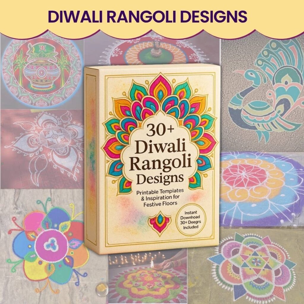- Includes a mix of modern minimal, floral, geometric, and diya-inspired rangolis