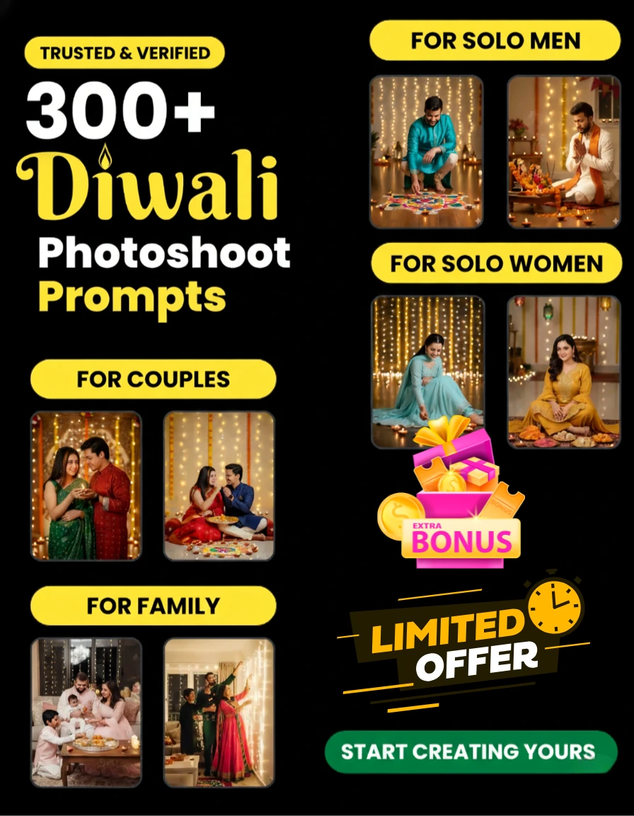 ✨ Create stunning, high-quality Diwali visuals: no photographers, studios, or expensive setups needed! Bring your dream Diwali photoshoots to life using the power of AI tools like Google Gemini.